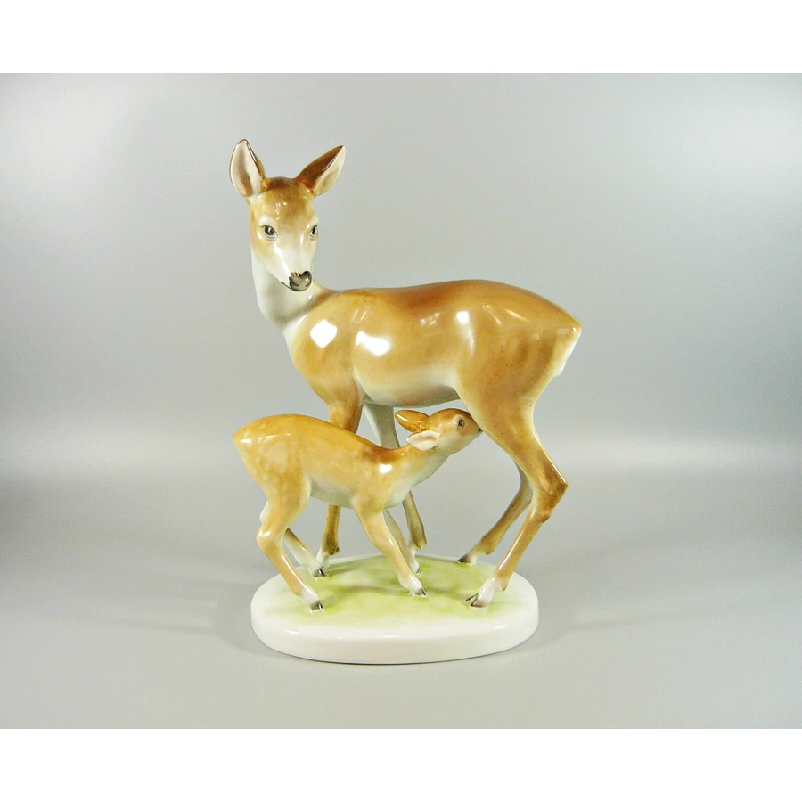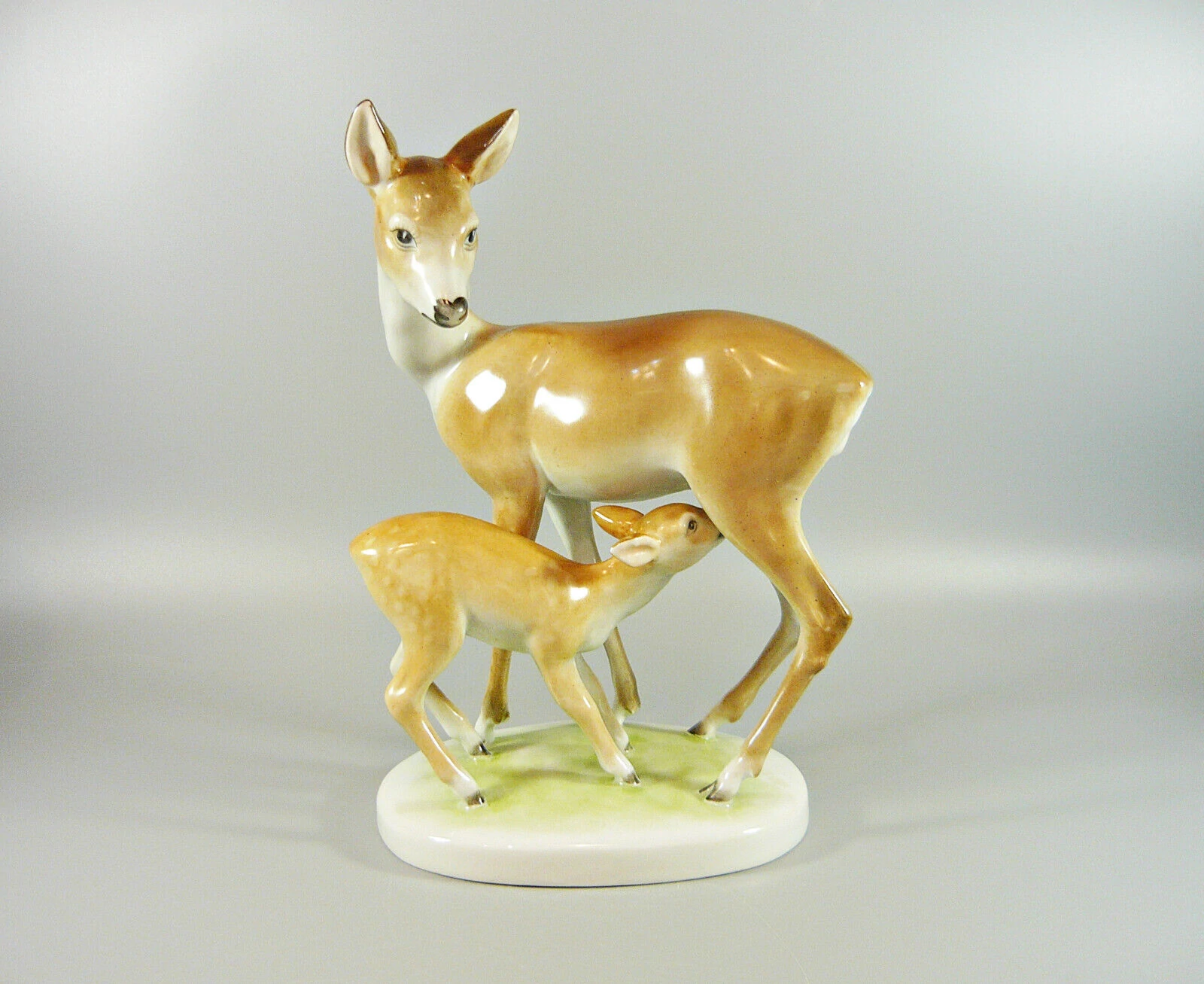 HEREND, DEER MOTHER WITH HER FAWN 9.8", HANDPAINTED PORCELAIN FIGURINE ! (I088) Artist signed on the base : Boldogfai Farkas Sándor (1907-1970)