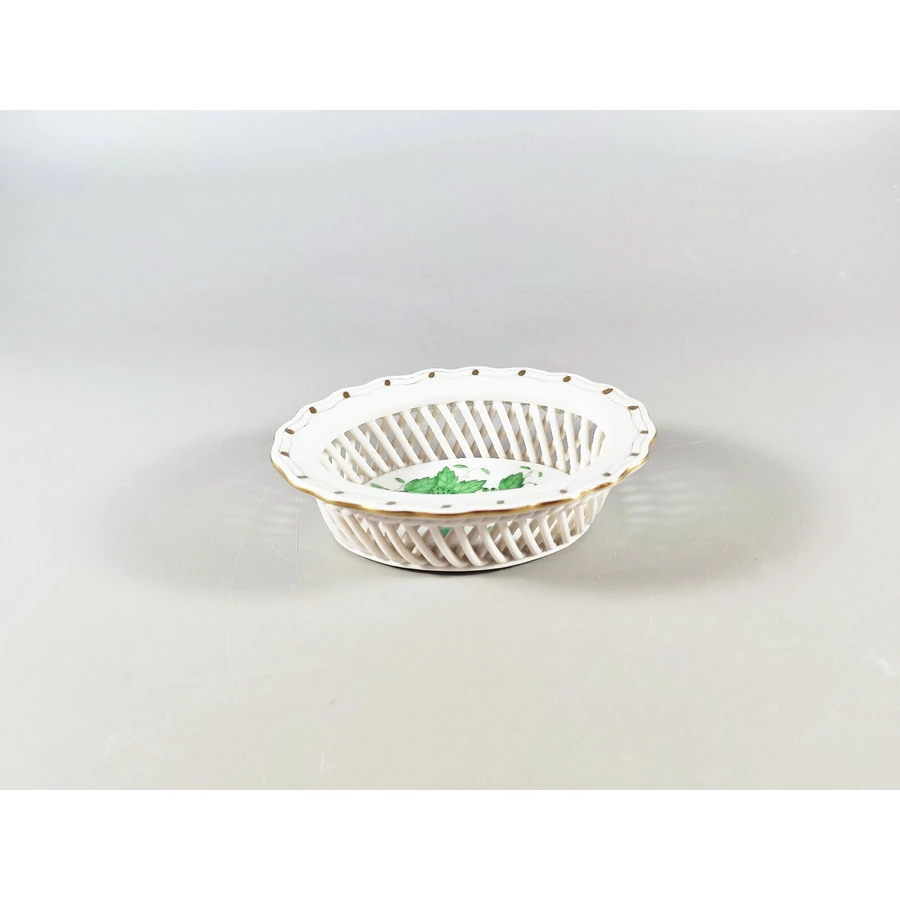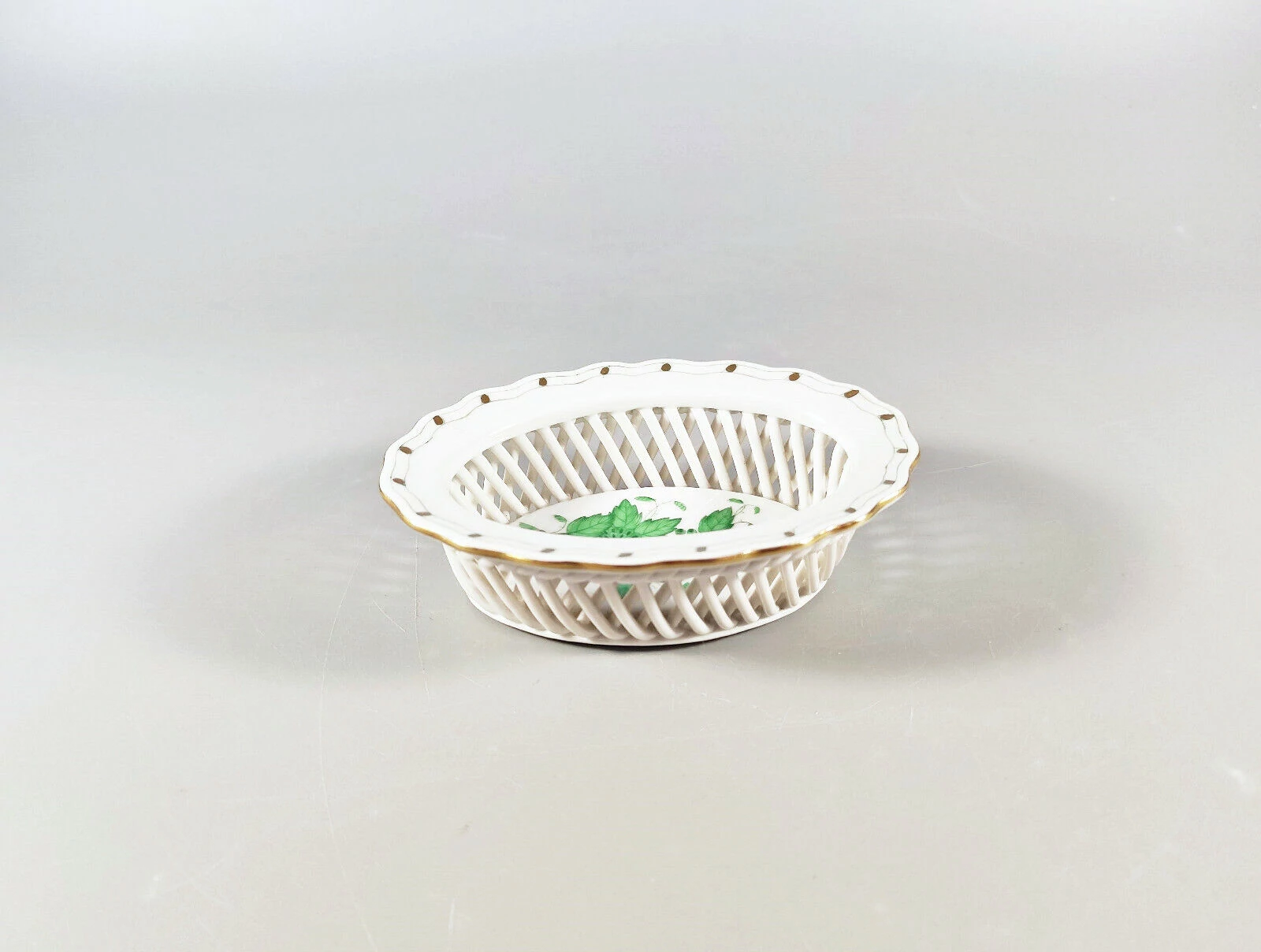 HEREND, GREEN CHINESE BOUQUET (AV) SMALL BASKET, HANDPAINTED PORCELAIN ! (I113)