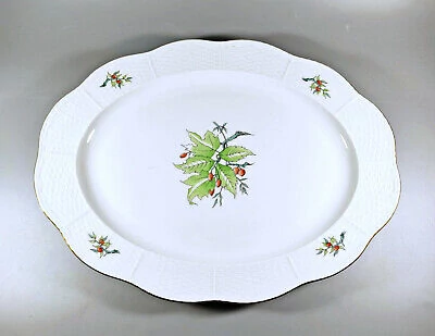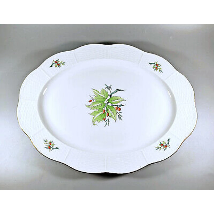HEREND, ROSEHIP MOTIVE (162) CHARGER TRAY 14", HANDPAINTED PORCELAIN ! (A035) Mark / Sign : Signed Herend Second Class Blue Mark and Incised "HEREND" Modell No.162 ! Condition : USED, EXCELLENT, No Chips, No Cracks or Repairs ! Size CCA. Inches / Centimeters Height : 1.26 " / 3.2 cm. Length : 14.37" / 36.5 cm. Width : 10.94" / 27.8 cm.