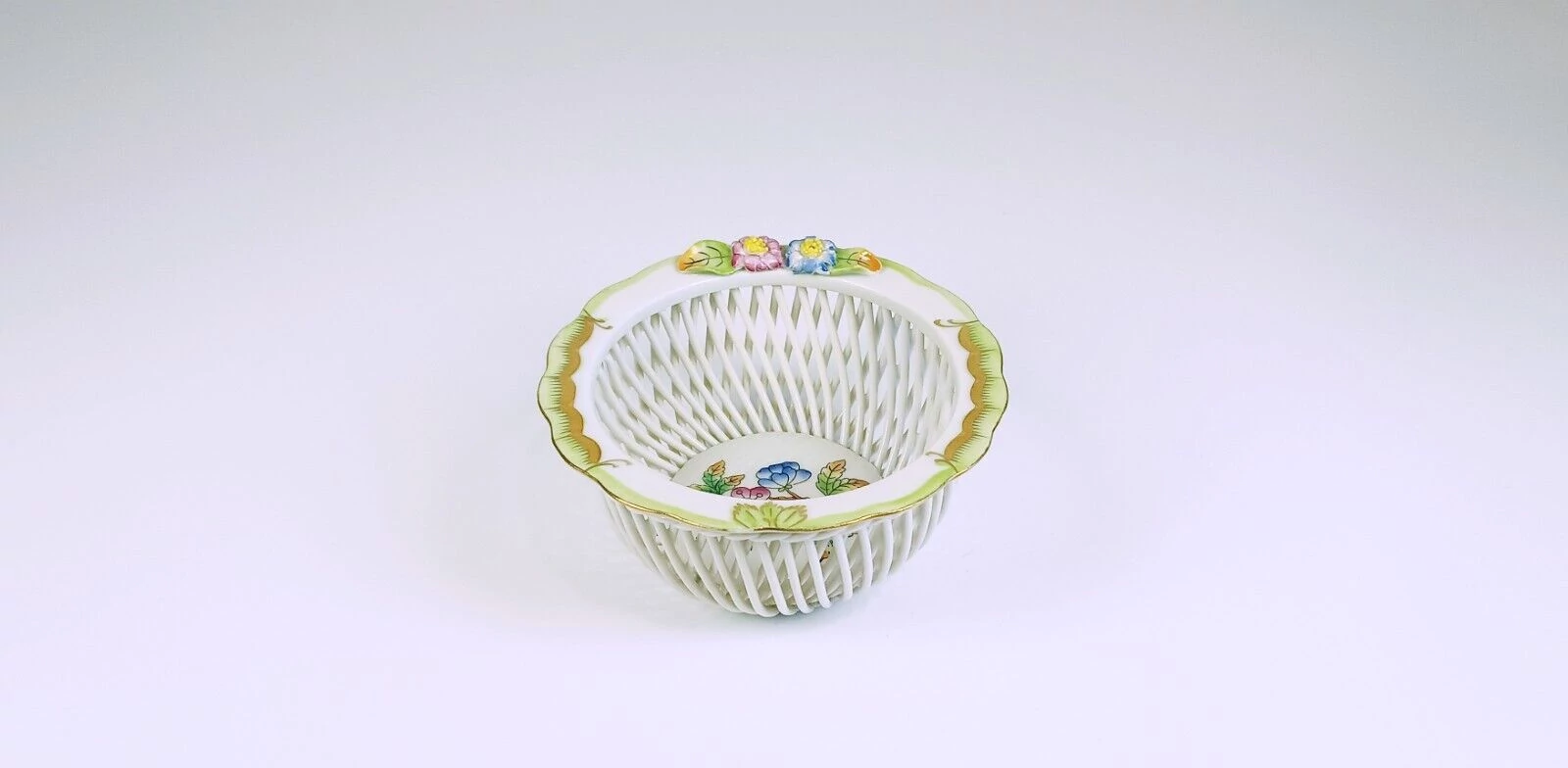 HEREND, VICTORIA (VBO) OPEN WEAVE BASKET 4" WITH FLOWER DECORATION, HANDPAINTED PORCELAIN (B160)