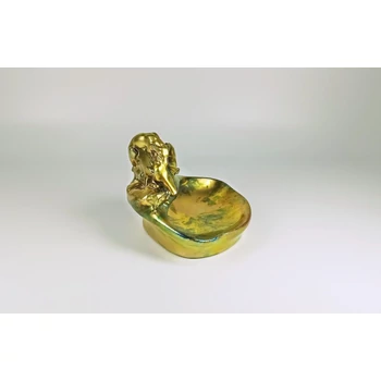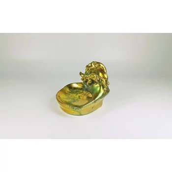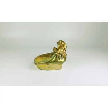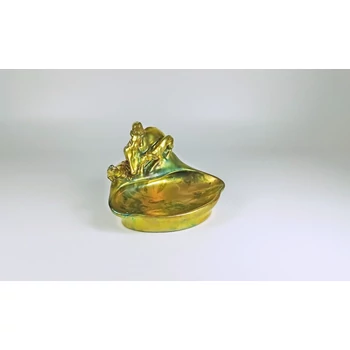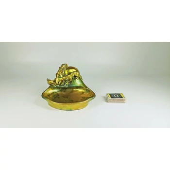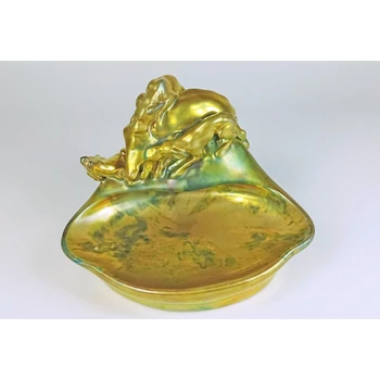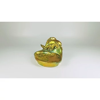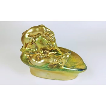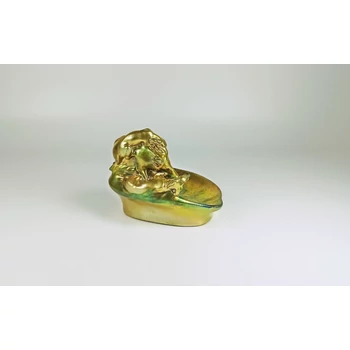 ZSOLNAY, GREEN EOSIN GLAZED PORCELAIN BUSINESS CARD HOLDER, DOGS HUNTING A BOAR ! (B153) In 1893, under the influence of Clément Massier's lusterware, Zsolnay's chemist developed a rich iridescent glaze, marketed as "eosin." The term, named after the Greek goddess Eos, goddess of dawn, was soon to be used to denote the rainbow-hued iridescent finish. Mark / Sign : Signed on the bottom, Zsolnay Pécs Five Temple Mark 1930's ! Condition : EXCELLENT, NO CHIPS, NO CRACKS OR REPAIRS ! Size CCA. Inches / Centimeters Height : 4.52" / 11.5 cm. Length : 6.26" / 15.9 cm. Width : 5.07" / 12.9 cm.